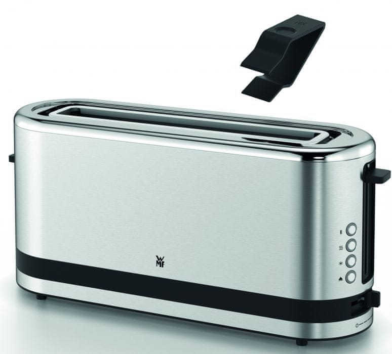 Estetski toaster WMF KITCHENminis Long Slot za okusno pripravo dveh XXL kosov toasta, za en dolg kos kruha, dve polovici bagel kruha ali pa za peko sendvičev. Poleg tega omogoča topljenje, pečenje ali segrevanje kruha. Narejen je iz nerjavečega in visokokakovostnega Cromargan jekla, hkrati pa zagotavlja, da ohišje med peko ostane hladno. Z močjo 900 W skoraj brez čakanja zagotavlja idealne temperature, hkrati pa omogoča nastavitev sedmih stopenj zapečenosti. Ponaša se s tankim dizajnom in s tem zavzame zelo malo prostora.