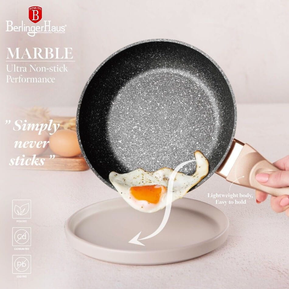 • material: kovani aluminij z marmornato površino- barva: Rose Gold, kovinska- premer: 30 cm- višina: 8 cm- 3-slojna neprijemljiva površina z marmornatim vzorcem- ergonomski ročaji z mehkim oprijemom- TURBO indukcija …