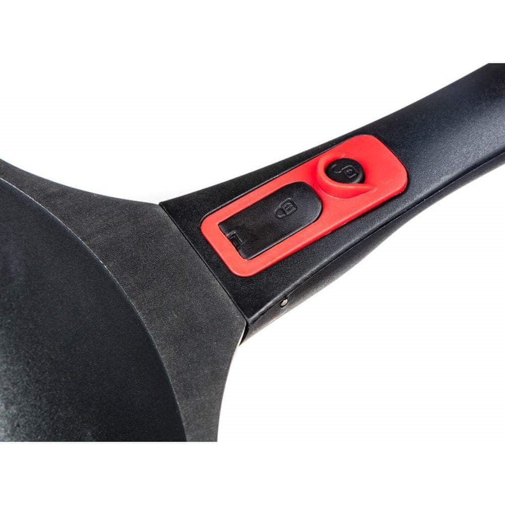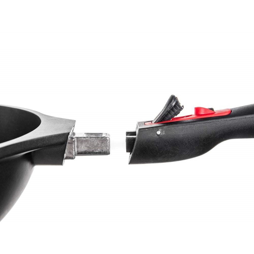 Lita aluminijasta ponev WOK s steklenim pokrovom z odstranljivim ročajem ADVANTAGE je opremljena z notranjo 3-slojno neprijemljivo površino ILAG ULTIMATE SWISS Technology in zunanjo 2-slojno toplotno odporno prevleko. Ponev ima bakelitni ročaj z mehko obdelavo na dotik, pokrito indukcijsko dno s toplotno odporno prevleko in odstranljiv ročaj, ki omogoča uporabo ponve v pečici (brez pokrova), hkrati pa pomaga prihraniti prostor v kuhinji. Pokrov je opremljen s črnim silikonskim tulcem.