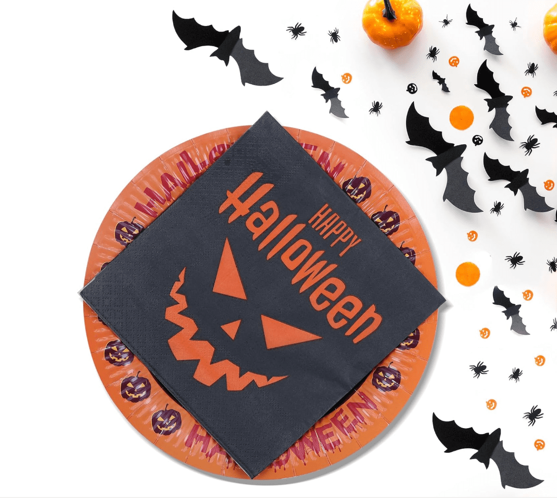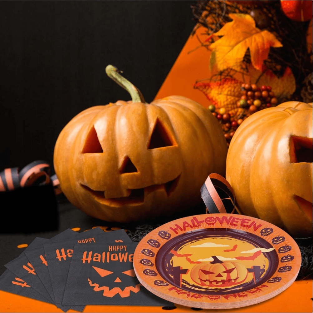 - PrtiÄŤki in kroĹľniki za enkratno uporabo: Z natisnjenimi in nasmejanimi bučnimi našitki, idealni za morilsko okrašeno zabavo za noč čarovnic.