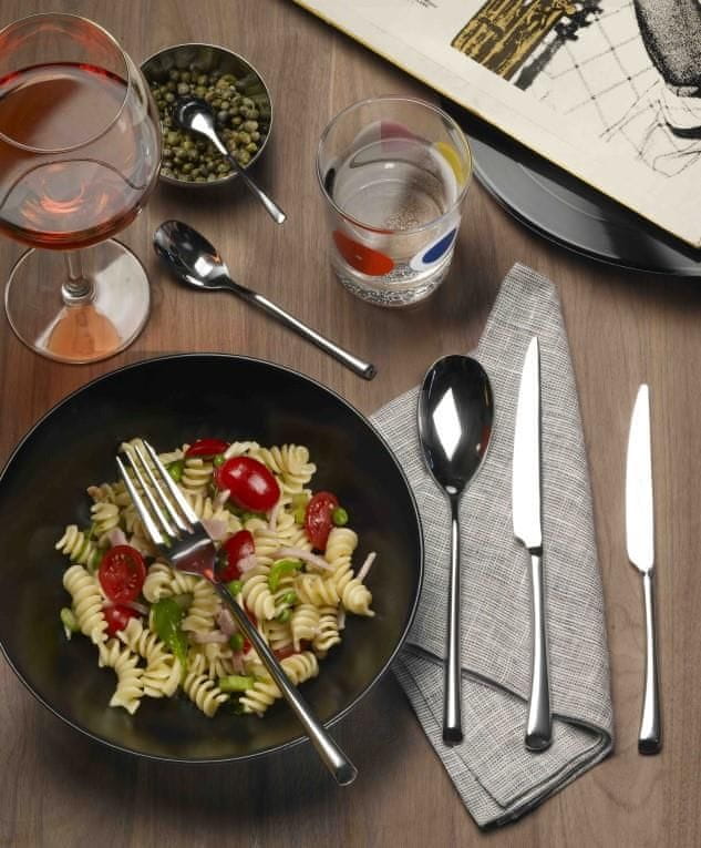 Pribor Trumpet s svojo prepoznavno oglato obliko in nadstandardno debelino poskrbi za dober izgled vsake mize. Oglate in nekoliko prilomljene oblike jedilnega pribora Trumpet dopuščajo, da se linija prijetno kombinira s prav različnimi oblikovnimi jeziki na mizi, nje izgled pa bo poskrbel, da bo na mizi izstopala.
