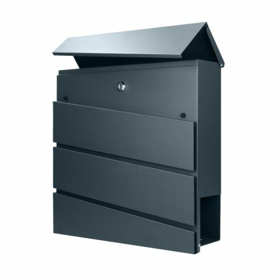 Sodoben poštni nabiralnik ki s svojo obliko pritegne pozornost Primeren za namestitev v zaprtih prostorih in na zunanje fasade ali ograje Zaradi velike velikosti je nabiralnik zelo prostoren in zlahka sprejme korespondenco formata A4 Dno nabiralnika ima luknje ki odvajajo vlago in ščitijo korespondenco pred vlago Ohišje je izdelano iz pocinkanega prašno barvanega jekla kar zagotavlja odpornost na ostre vremenske razmere Nabiralnik ima priročno odpiranje s ključem 2 kosa priložena in držalo za časopise