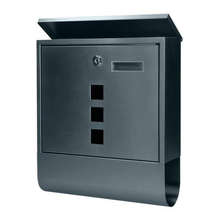 Sodoben poštni nabiralnik ki bo eleganten in učinkovit okras vašega doma Primeren za namestitev v zaprtih prostorih in na zunanje fasade ali ograje Zaradi velike velikosti je poštni nabiralnik zelo prostoren in zlahka sprejme korespondenco formata A4 Ima tudi držalo za časopise imensko ploščico in okence ki niso le dekorativna temveč omogočajo tudi ogled poštnega nabiralnika Ohišje je izdelano iz pocinkanega prašno barvanega jekla kar zagotavlja odpornost na ostre vremenske razmere Poštni nabiralnik ima priročno odpiranje s ključem priložena 2 kosa Tehnični parametri Splošne informacije Način namestitve Nadometna montaža Primerno za montažo več poštnih nabiralnikov Število poštnih nabiralnikov 1 Material Pocinkano jeklo Barva Antracit Širina predala 307 Višina predala 340 Globina predala 100 Vstavljanje Sprednja stran Odstranjevanje Sprednja stran S predalom za časopise Da