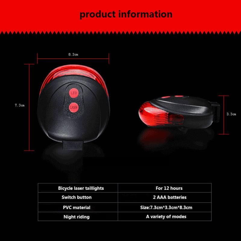 To luč z lahkoto pritrdite na svoje kolo, usmerite jo nazaj proti tlom, da v temi opozori prihajajoče kolesarje ali motoriste. Ima laserske in LED luči z različnimi nastavitvami. Svetilka je vodoodporna, brez težav jo lahko uporabljate v dežju.