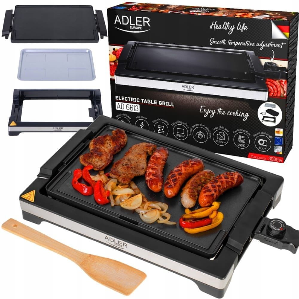 Zahvaljujoč nastavljivemu termostatu lahko izbirate med različnimi temperaturami, premazana plošča proti prijemanju pa omogoča zdravo pripravo hrane brez odvečne maščobe. Odstranljiva rešetka in zbiralnik za maščobo zagotavljata enostavno čiščenje, ergonomski ročaji pa varno uporabo.