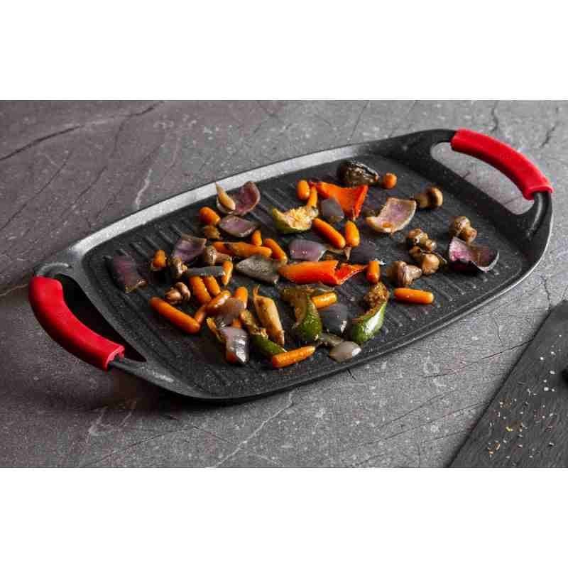 Plošča za žar iz kolekcije posode Burgundy Edition z marmornato površino je kot nalašč za peko na žaru doma ali na prostem. Uporabljate jo lahko na vseh vrstah štedilnikov, v pečici ali zunaj na žaru. Zelo učinkovita je tudi za neposredno serviranje specialitet z žara. Zaradi pametno oblikovanih ročajev je rokovanje z njo udobnejše in varnejše kot z običajnimi talinami. S ploščo lahko na štedilniku, v pečici ali na žaru z minimalno količino maščobe pripravljate meso, zelenjavo, ribe, klobase, hamburgerje, volovsko repo ali celo pico, zahvaljujoč marmornati površini.