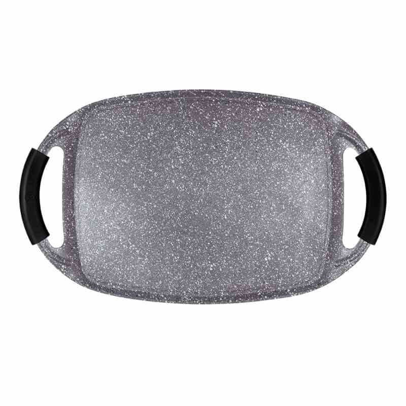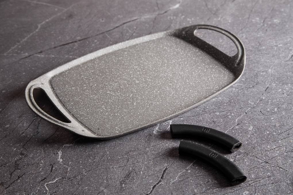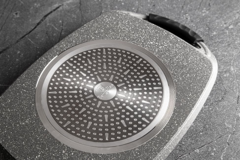 • dimenzije: 47 × 29 cm material: lit aluminij triplastna neprijemljiva površina z marmornatim vzorcem za kuhanje z minimalno količino maščobe barva: srebrna/črna- TURBO indukcijska baza odstranljivi silikonski ročaji …