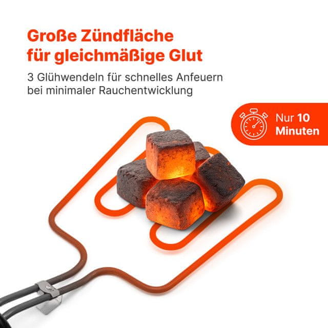 Električni vžigalnik briketov za žar je primeren za varno prižiganje žara na oglje ali brikete. Z močjo 800 W jih lahko segreje v 10 minutah. Zaradi odsotnosti kemikalij ni neprijetnih vonjav in le minimalno dima. Njegovo upravljanje je zelo preprosto. Ročaj je toplotno izoliran in tako ostane hlade Celoten opis
