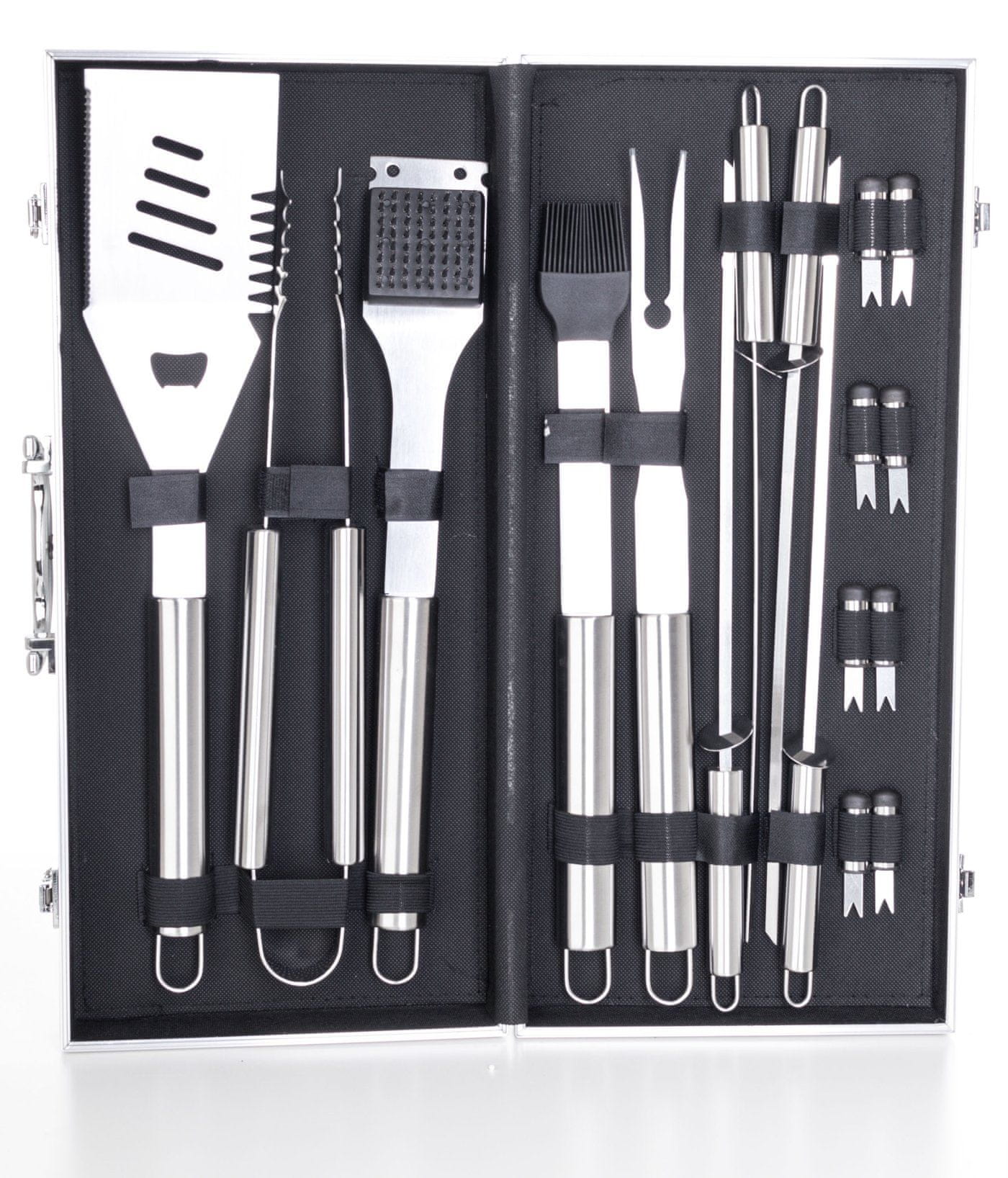 Komplet vsebuje popolno orodje za brezskrbno peko na žaru. V kompletu so vključeni obračalnik, vilice, klešče, krtača za krtačenje, krtača za čiščenje, nabodala za enostavno uživanje koruznih storžev in žara za pripravo nabodal. Dolžina orodja 40 cm zagotavlja, da med peko na žaru iz mesa ne bodo švigali plameni ali šumeče olje. Za lažje prenašanje in shranjevanje je orodje shranjeno v praktičnem aluminijastem kovčku.
