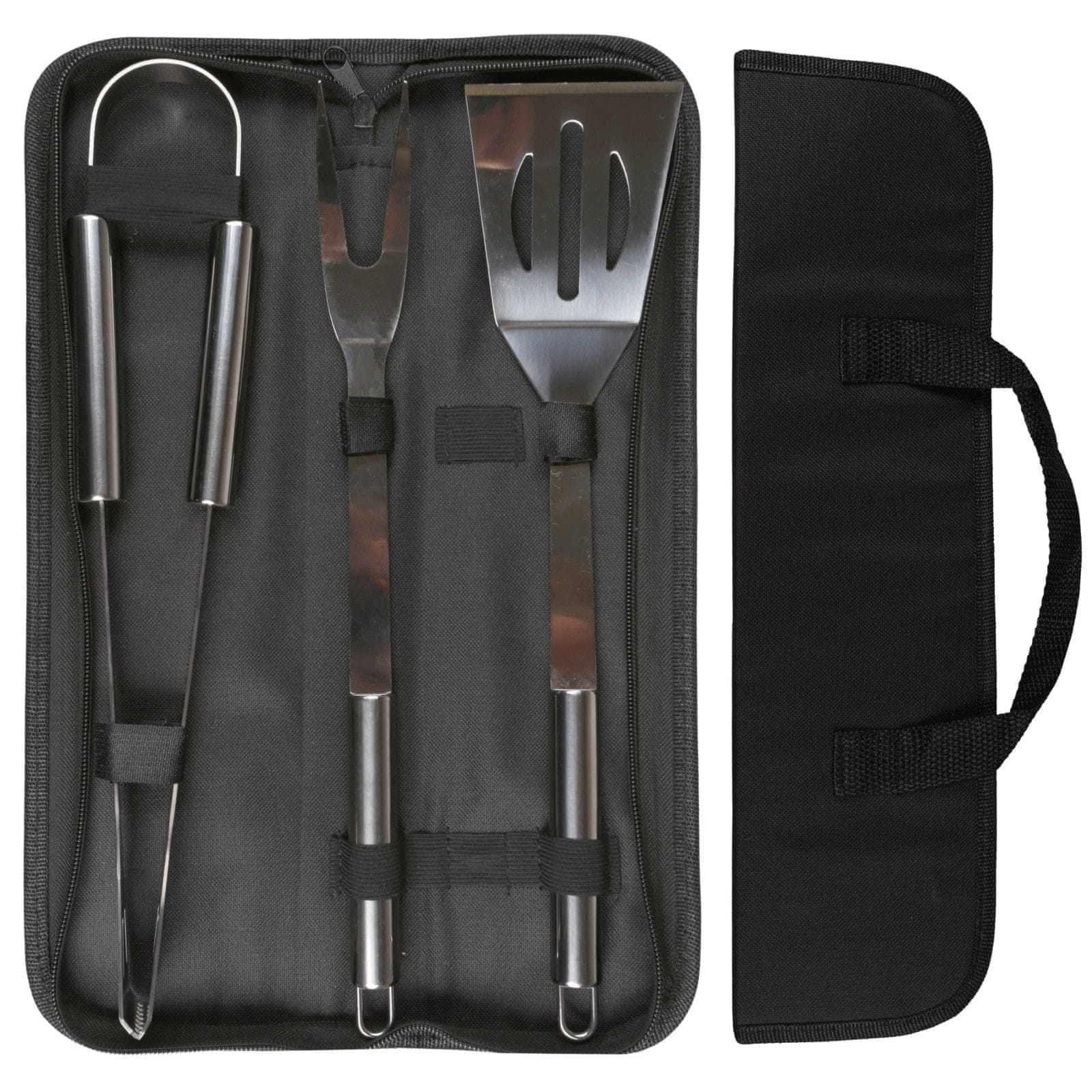 Popolnoma nepogrešljiv pripomoček: v kompletu najdete tri temeljna orodja: lopatko z luknjami za odvajanje maščobe (35 × 7,6 cm), robustne klešče (34 × 4,2 cm) in ostre vilice (35 × 3,2 cm)
