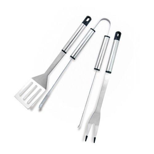 Orodje za žar AE176 je tridelni komplet pribora, ki vam bo odlično služil pri peki odličnih dobrot na žaru. V paketu boste našli vilice, klešče in lopatko za obračanje. Ta 38 cm dolg jedilni pribor je izdelan iz kromiranega nerjavečega jekla s črnimi plastičnimi elementi s praktičnimi ročaji, ki vam omogočajo, da ga shranite blizu žara.