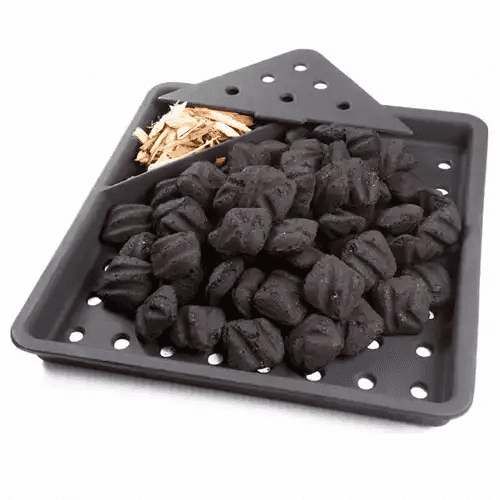 Litoželezni vložek za oglje s prostorom za sekance, ki vam omogočajo dimljenje. Oglje enostavno prižgete s plinskim gorilnikom žara.