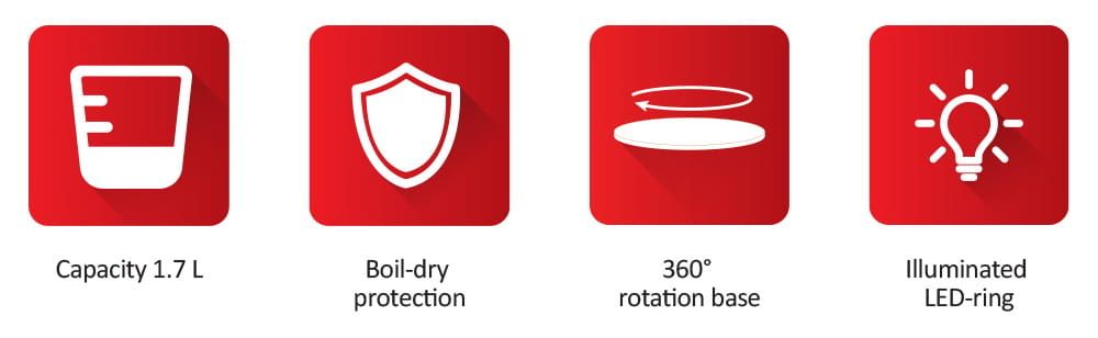 Hitrost in moč – 2000 W Vodo zavre v trenutku in vam tako vsak dan prihrani čas. Popolno za zaposlene ljudi! Tehnični podatki: Prostornina: 1,7 l Moč: 2000 W LED osvetlitev ozadja (modra) 360° vrtljivo podnožje