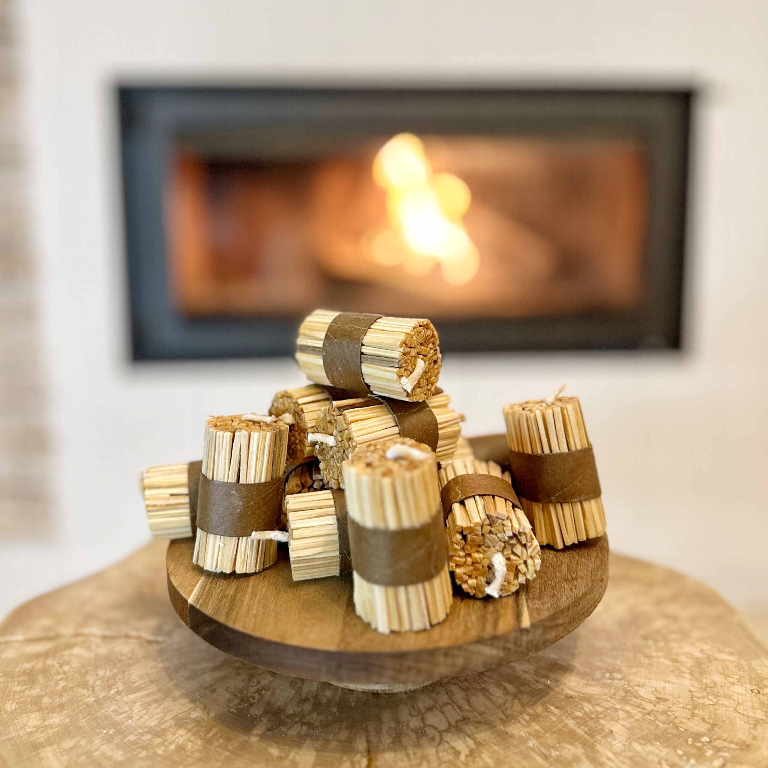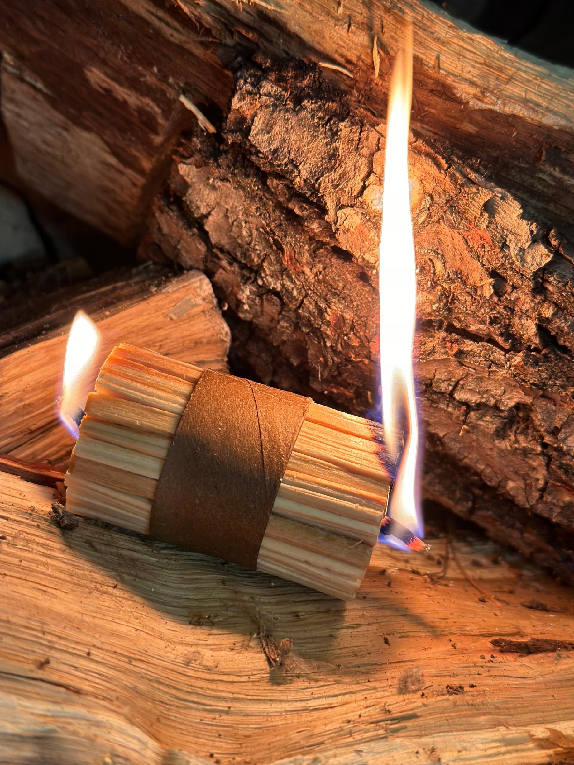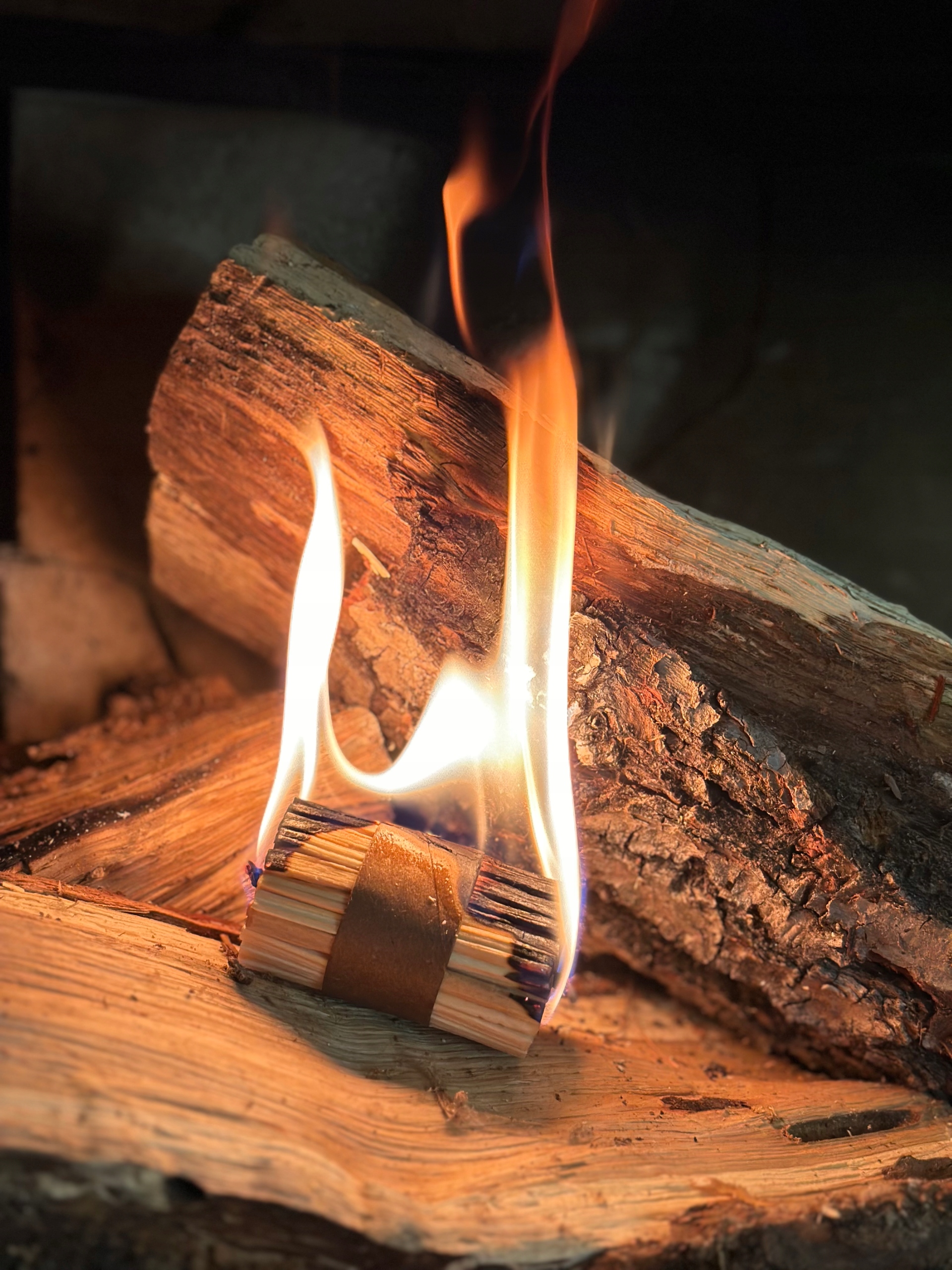 To so ekološka, naravna, brez vonja vžigalna drva, izdelana v celoti iz recikliranih materialov. Za izdelavo se uporabljajo kosi smolnatega lesa, kartonski trakovi in vosek.