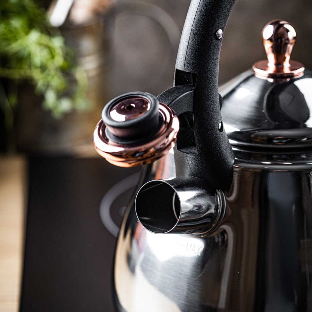 Jeklen grelnik vode s piščalko, izdelan iz visokokakovostnega nerjavečega jekla. Je zelo dekorativen element v vsaki kuhinji. Grelnik vode je zasnovan tako, da vodo zavre v najkrajšem možnem času. Hitrejše vrenje prihrani energijo, kar posledično prihrani denar.