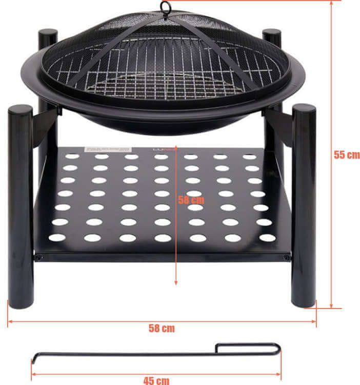 En stor, portabel eldstad med grill gör tiden i trädgården med familj och vänner roligare. Den är perfekt för att säkert förbereda en lägereld, som värme- och ljuskälla, och även ett dekorativt element i trädgården. Den nedre hyllan fungerar utmärkt som vedbod