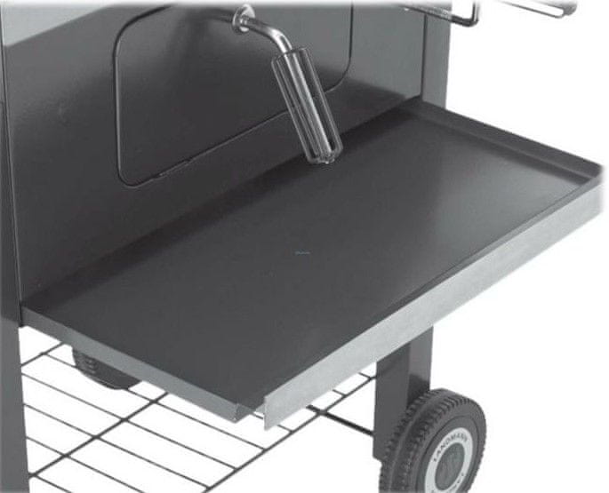 Sprednji del žara je opremljen z velikimi vrati za lažji dostop. Čiščenje je enostavno zahvaljujoč odstranljivem predalu za pepel. Žar ima dve stranski polici, namenjeni za odlaganje hrane ali drugih pripomočkov. Polici sta zložljivi, kar bo odlično prihranilo prostor, ko boste žar shranjevali. Pod žarom, kjer je prostor za shranjevanje, imate lahko shranjeno oglje, tako da bo vedno pri roki. Ob strani se nahaja prezračevalna luknja, ki omogoča pretok zraka in vpliva na stopnjo gorenja. Žar ima tudi dve kolesi, ki služita za lažje prevažanje po terasi ali vrtu.