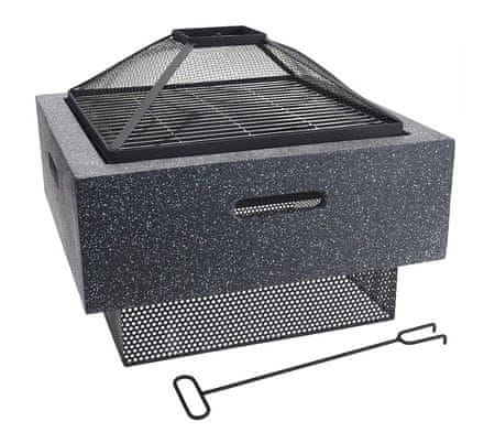• dizajnerski kamin iz umetnega kamna bo ustvaril čudovito pristno vzdušje na vašem vrtu, terasi ali koči – z ali brez prižganega ognja bo postal osrednji del vaše vrtne zabave, večernega posedanja ob ognju ali žara – na snemljivi kromirani rešetki lahko v celoti pečete na žaru – material: jeklo / MgO – visokokakovostna, robustna zasnova iz toplotno odpornega umetnega kamna zagotavlja dolgo življenjsko dobo – veliko kvadratno dno zagotavlja odlično stabilnost, kamin se nikoli ne maje ali prevrne – vključuje jeklen pokrov z ročajem, ki lovi iskre, zaradi česar je kamin varen za uporabo na občutljivih površinah in na trati – večnamenska uporaba, idealen za vrt, dvorišče, teraso ali kočo – kurjenje ognja predvsem z lesom, ogljem ali briketi – sploh ni težko premikati in rokovati, teža je ustreznih 11 kg, poleg tega pa ima dva praktična integrirana ročaja ob straneh – paket vključuje tudi grebljico – DIMENZIJE: – dimenzije rešetke žara: 41 × 41 cm – dimenzije osrednjega kamnitega dela: 53 × 53 × 18 cm – višina brez pokrova, za kamnito oblogo: 30 cm – skupna višina: 41 cm
