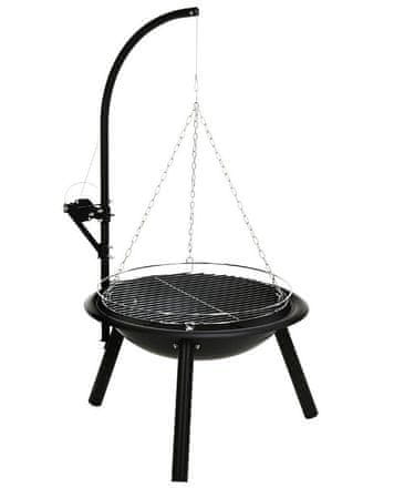 • kurišče/žar z nastavljivo rešetko za žar – priljubljen model žara na oglje „Tripod“ – prostorna rešetka za žar s premerom 50 cm – nastavljiva višina rešetke za žar z verigo – črna barva, odporna.