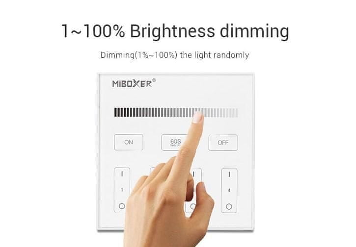 Je stenski MONO stekleni zatemnilnik na dotik, bele barve. Zagotavlja 4-conski individualni nadzor, pri čemer vsaka cona oz. območje krmili nešteto število svetilk ali krmilnikov. Namenjen je enobarvnim LED trakovom.