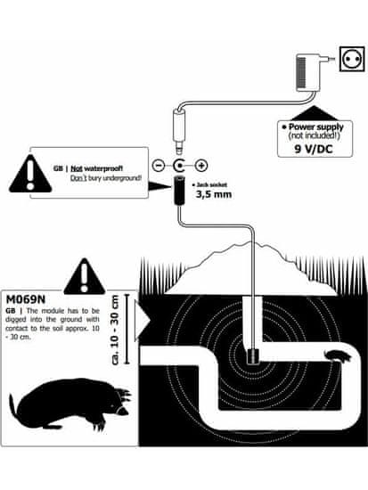 Vodotesni odganjalec krtov in voluharjev ustvarja agresivne seizmične vibracije v hitrih intervalih, ki se dobro širijo po zemlji, krti, voluharji in podobni glodavci pa se jim v velikem loku izognejo. Napravo zakopljete pribl. 100–300 mm globoko v zemljo v bližini rovov, ki so jih naredile živali, napajanje pa poteka prek kabla z obratovalno napetostjo 9 V/DC. Zadostuje za površino vrta največ 1.000 m².
