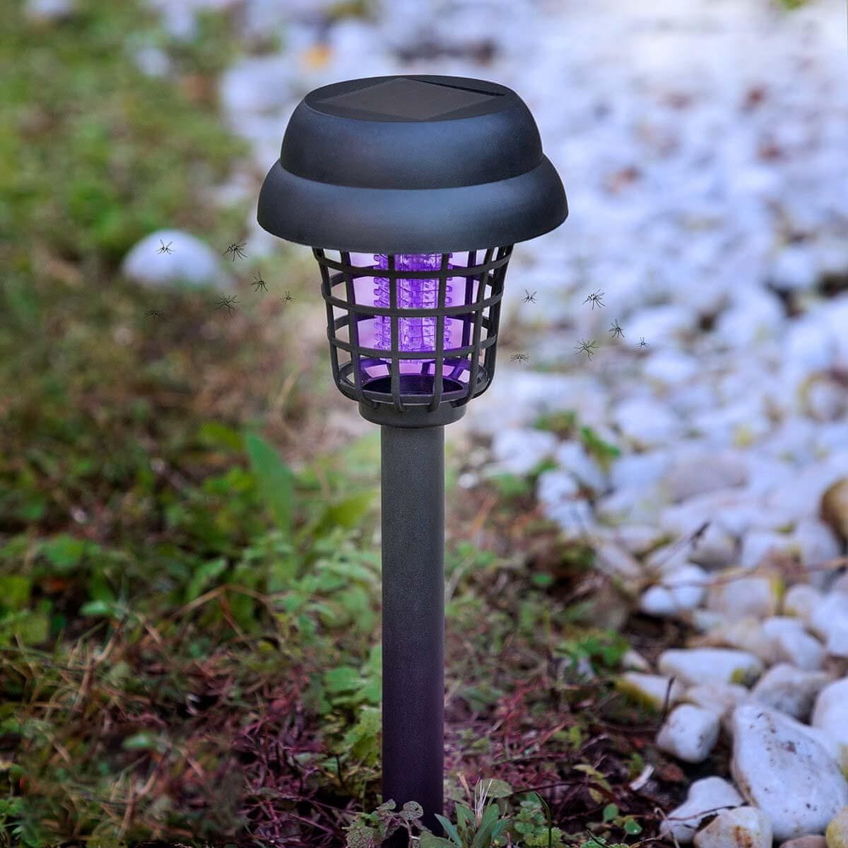Svetilka na sončne celice, ki uničuje komarje in jo potisnemo v zemljo na vrtu. Ima baterijo, ki se polni s sončno energijo in ubija komarje in druge leteče insekte brez potrebe po kemičnih izdelkih. Svetilka ima stikalo s tremi položaji, zahvaljujoč solarnemu panelu pa se čez dan polni s sončno svetlobo.