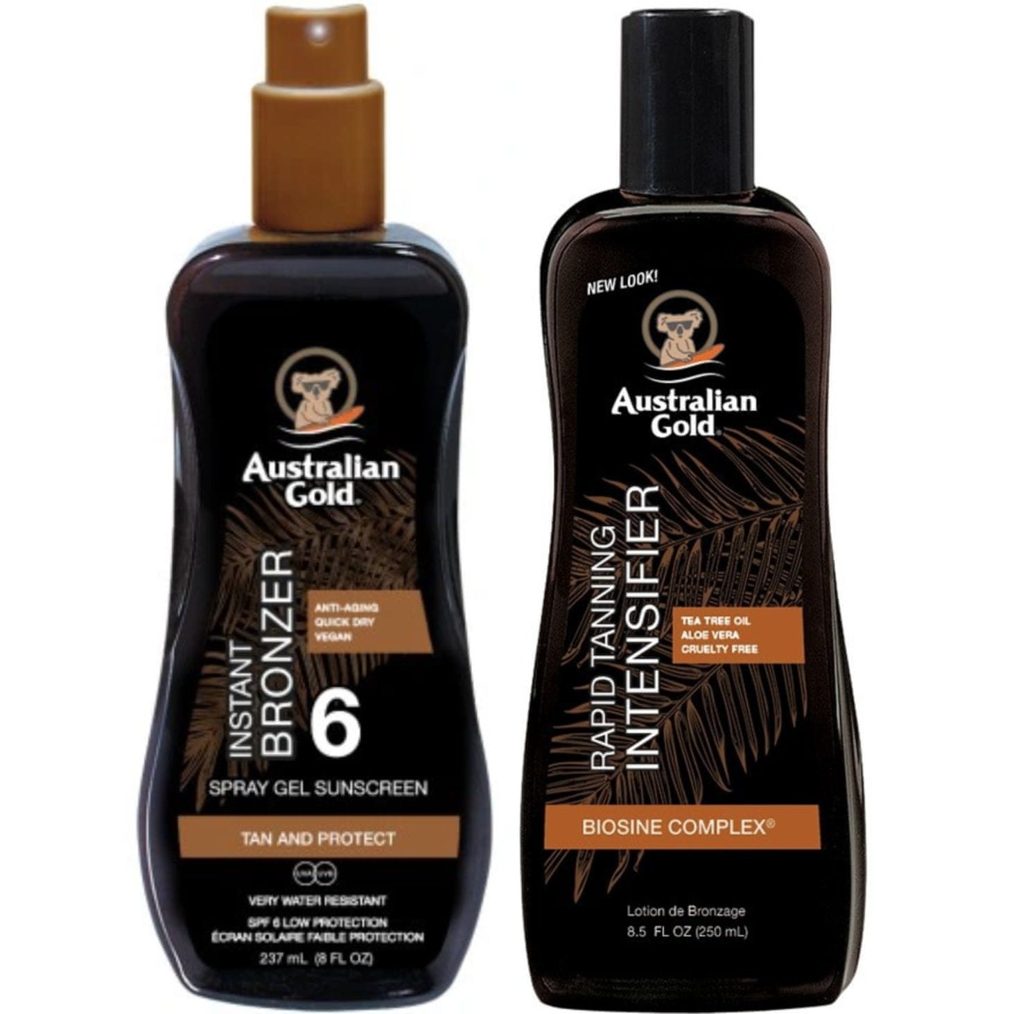 Gel v pršilu Australian Gold SPF6 + Rapid Tanning Gel v pršilu Australian Gold z bronzerjem SPF6 Gel v pršilu Australian Gold SPF 6 z bronzerjem v spreju zagotavlja odlično zaščito pred UVA in UVB žarki. Naravni karamelni bronzerji vas bodo porjaveli hitreje in globlje. Kakadu sliva, aloe vera, vitamin E in olje čajevca zagotavljajo odlično nego kože. Vsa razpršila za porjavitev Australian Gold SPF v temnih tubah vsebujejo visokokakovostne naravne bronzerje. Australian Gold SPF 6 sprej gel z bronzerji nudi odlično zaščito pred UVA in UVB žarki in se hitro vpije v kožo. In zahvaljujoč naravnim karamelnim bronzerjem boste porjaveli veliko hitreje in globlje. Vsebuje slivo kakadu (bogato z vitaminom C), aloe vero, vitamin E, olje avstralskega čajevca in izvlečke sončničnih semen, zaradi česar vaša koža ni le dobro zaščitena, temveč tudi odlično nahranjena. Australian Gold Rapid Tanning Intensifier Lotion takoj poskrbi za čudovito temno osnovno barvo. Ne vsebuje SPF. Takojšnja porjavitev in podaljšanje barve. Posebej oblikovan za uporabo na soncu zagotavlja takojšnjo, lepo, temno osnovno barvo. Ne vsebuje SPF, zato je primeren samo za izkušene obiskovalce na plaži. Biosine Complex, znamenita formula Australian GoldTM, poskrbi za čudovito porjavelost in odlično nego kože. Olja aloje, pantenola, čajevca in olivnega olja ščitijo in negujejo kožo med in po sončenju. Vitasome Complex (močni antioksidanti) spodbuja nastajanje novih kožnih celic. Liposomska tehnologija dovaja vsa hranila globoko v kožo, še posebej tam, kjer so najbolj potrebna. Čudovita poletna dišava „Cocoa Dreams.“ 250 ml steklenice.