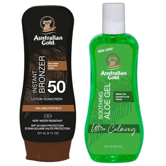 Australian Gold Bronze krema za sončenje SPF50 + aloe Australian Gold krema za sončenje z bronzerjem SPF50 Australian Gold SPF 50 krema za sončenje z bronzerjem zagotavlja odlično zaščito pred UVA in UVB sevanjem. Hitro daje vaši koži čudovito bronasto porjavelost. Australian Gold krema za sončenje SPF 50 z bronzerjem zagotavlja odlično zaščito pred UVA in UVB sevanjem. Vaši koži hitro daje naraven videz, temno porjavelost in zagotavlja optimalno nego kože. Naravna sredstva za porjavitev (vključno z izvlečki kave Kona) zagotavljajo izjemno hitro porjavelost tudi na prostem. Izvlečki slive kakadu (najbogatejši vir vitamina C), olje čajevca, izvlečki sončničnih semen, aloe vera, vitamin E, izvlečki kakavovega masla in alantoin poskrbijo za maksimalno hidratacijo, regeneracijo in hranjenje vaše kože. In vonj? fantastično je! Resnično se boste počutili kot na počitnicah. 237 ml steklenice. Australian Gold Soothing Aloe After Sun Gel 237 ml „Soothing Aloe After Sun Gel“ znamke Australian Gold® je gel brez olja, ki ga morate imeti v vaši počitniški torbi. Če je vaša koža po dnevu na plaži rahlo opečena, razdražena ali neprijetno napeta, je ta gel odlična rešitev. Kožo hladi, osveži in mehča. Vsebuje aloe vero, izvleček zelenega čaja, izvleček akacije, vitamin C, vitamin E in močne antioksidante. Lahko se uporablja tudi po sončenju v zaprtih prostorih. Nasvet: za večji hladilni učinek ga hranite v hladilniku. Kapaciteta 237ml Gel za razdraženo kožo. Hladi, osveži in mehča kožo.