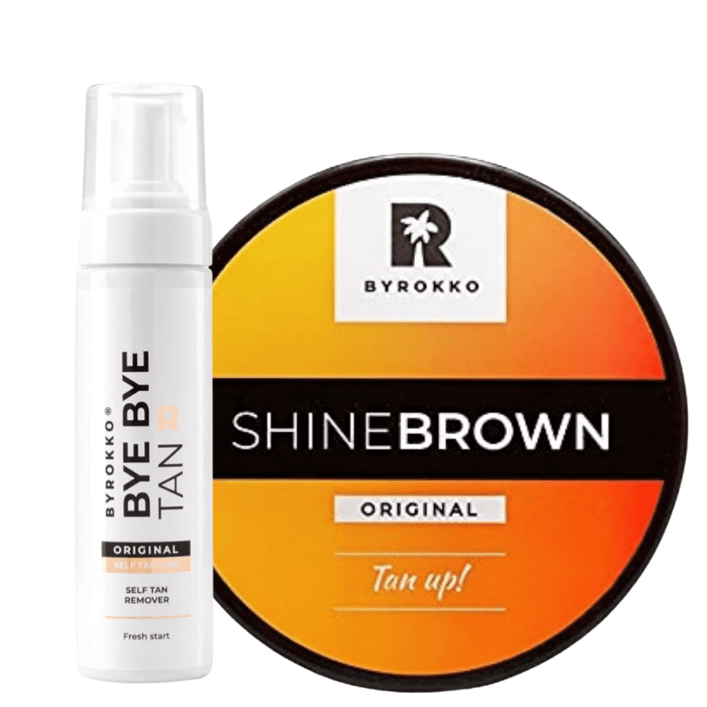 Byrokko Shine Brown + odstranjevalec samoporjavitve. Shine Brown Premium Accelerator krema za porjavitev 190 ml. Dosezite naravno, temnejšo in dolgotrajno porjavelost z manj izpostavljenosti soncu ali solariju. Pričakujte hitre rezultate ne glede na tip kože in uživajte v prednostih naravne porjavelosti z našo najbolje prodajano formulo, ki neguje in vlaži vašo kožo. Brez neprijetnih kemikalij. Znani vonj Shine Brown. Hitro vpojen nanos brez madežev. Pričakujte hitre rezultate ne glede na tip kože in uživajte v naravni izkušnji porjavelosti z našo najbolje prodajano formulo, ki neguje in vlaži vašo kožo. Naša prodajna uspešnica, ustvarjena brez krutosti in brez kemičnih dodatkov, je naravna bližnjica do porjavelosti, ki ste jo iskali. Dosezite naravno, vrhunsko porjavelost z izboljšano formulo kreme za porjavitev Shine Brown, ki zagotavlja ekstremne rezultate porjavelosti, vrhunsko navlaženost, regeneracijo kože in bogat, temen sijaj. Popoln je tako za solarije kot za sončenje, kar lahko potrdi več kot 500.000 zadovoljnih strank. Shine Brown™ bo po tem, ko ga preizkusite, postal vaša obvezna oprema, saj smo pomislili na vse, kar vaša koža potrebuje za doseganje najboljših rezultatov porjavitve. Vse, kar vaša koža potrebuje za popoln bronast videz. 100-odstotno naravno korenčkovo olje za kožo, pripravljeno na sonce in okrepljeno kožo, ekstra deviško oljčno olje za okrepitev porjavelosti, orehovo olje za zlat sijaj in kakavovo maslo za sijočo in napeto kožo. BYROKKO BYE BYE TAN ODSTRANJEVALEC SAMOPORJAVITVE 200 ml. Najhitrejši in najučinkovitejši način za odstranjevanje umetne porjavelosti ali pripravo kože na svež nanos pene za samoporjavitev. Ta lahka čistilna pena je primerna za vse tipe kože in brez težav odstrani umetno porjavelost, kožo pa pusti svilnato gladko in navlaženo. Primerno za obraz in telo. Sestavine, ki ne dražijo. Primerno za vse tipe kože. Najučinkovitejši način za odstranjevanje umetne porjavelosti ali pripravo na svežo porjavelost. Ta lahka pena je primerna za uporabo na obrazu in telesu za vse tipe kože. Z lahkoto odstrani umetno porjavelost, kožo pa pusti svilnato gladko in navlaženo. Edinstvena čistilna formula BYROKKO učinkovito odstrani porjavelost, vlaži in kožo naredi svilnato gladko. Znebite se porjavelosti, kopičenja ali stare porjavelosti v treh preprostih korakih. Kako uporabiti: Najprej izdatno nanesite Bye Bye Tan Remover na predele, kjer je potrebna odstranitev porjavelosti. Pustite delovati vsaj 5 minut. Nato se oprhajte s toplo vodo in z mokro krpo za obraz obrišite porjavelost.