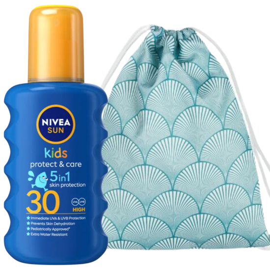 Nivea Kids Protect & Care SPF30 sprej + nahrbtnik za plažo Zagotovite koži svojega otroka pravo zaščito pred soncem z NIVEA SUN Kids Protect & Care! Ta losjon za zaščito pred soncem v razpršilu za otroke zagotavlja takojšnjo visoko zaščito pred soncem zahvaljujoč sistemu filtrov UVA/UVB SPF 30. Učinkovito ščiti pred sončnimi opeklinami in dolgotrajnimi poškodbami kože, ki jih povzroča sončna svetloba. Poleg tega sprej za sončenje za otroke preprečuje izsušitev kože med nego. Zaščitno pršilo za otroke je bilo ustvarjeno posebej za potrebe nežne otroške kože. Izdelek je vodoodporen in ima bledečo barvo, zaradi česar je uporaba zabavna za otroke! Formula Ocean Respect ne vsebuje oktokrilena, oksibenzona, oktinoksata in mikroplastičnih* filtrov, njena kožna toleranca pa je bila pediatrično potrjena. Zaščitite kožo svojega otroka z NIVEA SUN Kids pršilom za zaščito pred soncem, da bo lahko v celoti užival v poletju! Ključne lastnosti izdelka: Takojšnja UVA/UVB zaščita. Zasnovan posebej za potrebe nežne dojenčkove kože. Formula za enostavno mazanje z bledečo barvo za zabavno in enakomerno prekrivnost. Preprečuje izsušitev kože. Vodoodporen. Trajnostno – formula Ocean Respect je 78 % biorazgradljiva, ne vsebuje oktinoksata, oksibenzona, oktokrilena in mikroplastike. 95 % reciklirana plastenka (brez pokrovčka in črpalke). Opozorilo: Izogibajte se dolgotrajnemu izpostavljanju soncu, tudi če nanesete kremo za sončenje. Izdelki za zaščito pred soncem ne zagotavljajo 100-odstotne zaščite. Prekomerna izpostavljenost soncu predstavlja resno tveganje za zdravje. Dojenčke in majhne otroke zaščitite pred neposredno sončno svetlobo in nosite zaščitna oblačila. Izogibajte se neposrednemu stiku z oblačili in trdimi površinami, da preprečite madeže. Uporabljajte samo na prostem ali v dobro prezračevanem prostoru. Nahrbtnik za plažo Nivea Seashell. Ta edinstven nahrbtnik ima logotip Nivea. Narejen iz trpežnega materiala, odpornega na trganje, je udoben nahrbtnik za mesto ali plažo, popoln za prenašanje vseh vaših osnovnih stvari.