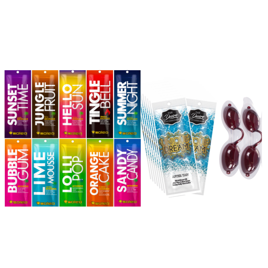 Soleo Basic 70+30 vrečk Paket 100 Paket + 20 Unique Dream + 2 Tan Desire Unique Dream Goggles Luxurious Balm 15ml x20 Nehajte sanjati o negovani, nahranjeni koži! Unique Dream vas bo prepeljal iz kraljestva sanj v resničnost! Ne glede na vašo polt ali stopnjo porjavelosti lahko ohranite zagorelo, žametno gladko in navlaženo kožo zahvaljujoč visoki vsebnosti olja žafranike, karitejevega masla in aloje. Niacinamid (vitamin B3), ki ga vsebuje balzam, ima aktivne lastnosti proti staranju in gubam. Za vsakodnevno uporabo, ne le po sončenju, da bo vaša koža čim dlje ostala mladostna. Tan Desire Unique Dream balzam za telo je priporočljiv za: vse, ne glede na polt ali stopnjo porjavelosti. Kako uporabiti: Enakomerno plast balzama dnevno nanesite na celotno telo. Po nanosu si temeljito umijte roke! Upoštevajte, da je ta izdelek namenjen samo za zunanjo uporabo. Dišava: čuten dotik. Zaščitna sončna očala Vision2 Rjava x2. Zaščitna sončna očala so nujna pri uporabi solarija. Ščitijo oči pred UVA in UVB sevanjem. Izdelane iz visokokakovostnih materialov se popolnoma prilegajo vašemu obrazu. Pakirano v priročni torbici. Priložen je tudi silikonski elastični trak. Na voljo v različnih barvah. Naša UV zaščitna očala lahko zaščitijo vaše oči pred UV sevanjem, rdečo svetlobo in IPL. So vsestranski in ekonomični. Očala so ergonomska in udobna za nošenje. Zaščitna očala so primerna za IPL, kozmetične laserske tretmaje, LED tretmaje, odstranjevanje tetovaž, beljenje zob, sončenje v zaprtih prostorih ali na prostem itd. Primerna za uporabo v kozmetičnih salonih, zobozdravstvenih ordinacijah ali doma. Soleo Bubble Gum bronzer s pospeševalnikom 15 ml. Obožuješ žvečilni gumi? Napihujete tako velike balone, da vam počijo na nosu? Se smejiš do solz in znova poskušaš pihati še bolj? Podobno vas bo razveselil močan bronzer Bubble Gum, ki bo poskrbel za čudovito bronasto polt (zahvaljujoč DHA) in pospešil razvoj naravne porjavelosti (tirozin). Vašo kožo bo razvajal s svojo obstojnostjo, odlično nego, hranjenjem (olje žafranike, vitamin B), hidratacijo (aloja in rastlinski proteini) in čudovito gladkostjo. Navdušil bo vaše čute. In to je to! Dišava: krema makadamije. Soleo Bubble Gum Bronzer s pospeševalnikom priporočamo za: že porjavelo kožo, za običajne solarije. Soleo Hello Sun Ultra Accelerator 15 ml. Hrepenite po soncu, njegovi toploti in žarkih, ki obdajajo vašo kožo? Čudovit odtenek zlate porjavelosti? Posezite po čudovitem Hello Sun, polnem tirozina, ki pospešuje porjavelost, in množice globoko vlažilnih in regeneracijskih sestavin za podaljšanje bronastega učinka. Uživajte v popolnoma nahranjeni in gladki koži zahvaljujoč visokim odmerkom aloje, PCA soli, rastlinskih beljakovin, kokosovega olja, kakavovega masla in kolagena. Dišava: sončna pijača. Soleo Hello Sun Ultra Accelerator priporočamo: tistim, ki šele začenjajo porjaveti in tistim, ki občasno porjavijo. Soleo Lime Mousse Accelerator 15 ml. Obožujemo osvežilno limonado, ki poskrbi za ohladitev v vročih dneh. Njegova rahla sladkoba v kombinaciji z limonino kislostjo ustvarja popolno kombinacijo, tako kot v tem balzamu karitejevo maslo kombinirano z izvlečkom zelenega čaja, ki odlično delujeta skupaj. Zagotavlja prehrano, regeneracijo in hidracijo, hkrati pa ščiti pred prostimi radikali in pospešenim staranjem. Kaj več bi si lahko želeli? No, morda le pomirjujoča aloja in visok odmerek tirozina za hitro doseganje naravne porjavelosti. Tudi ta želja se je izpolnila. Vonj: limeta z grozdjem. Soleo Lime Mousse Accelerator priporočamo: tistim s srednjo porjavelostjo ali tistim, ki ne marajo bronzerjev. Soleo Lolli Pop Accelerator 15 ml. Nasmehnite se in sezite po pospeševalniku Lollipop. Naj vas vesela embalaža in čudovit pudingasti vonj ovijeta v sladkost čutne nege. Ta prijeten pospeševalnik poskrbi za udobje med sončenjem in pospeši videz zlato rjave polti (tako deluje tirozin). Zahvaljujoč uporabi kakavovega masla, konopljinega olja in olja Monoi bo vaša koža prejela močan zagon prehrane in regeneracije. Postala bo okrepljena in popolnoma navlažena, a hkrati mehka in gladka. Preprosto čudovito! Soleo Lolli Pop Accelerator priporočamo: tistim, ki neredno porjavijo, še posebej tistim s svetlo poltjo ali tistim, ki ne marate bronzerjev. Soleo Orange Cake Strong Accelerator 15 ml. Predstavljajte si pomarančo, ki je tako sladka, da vas bo očarala, tako sočna, da boste obžalovali vsako kapljico, tako sončna, da ne morete odmakniti oči od nje. Zdaj pa si predstavljajte balzam, ki vas očara že ob prvem nanosu, ki zapelje vaše čute in zahvaljujoč tirozinu intenzivno pospeši vašo porjavelost. Odprite oči in posezite po pomarančni torti, prepojeni s čudovito negovalnimi in gladilnimi sestavinami, kot so konopljino olje, olje žafranike, pomarančno olje in olje Monoi. Očara z učinkovitostjo vlažilnih dodatkov, kot sta sok aloe vere in PCA sol, ter očara z omamnim vonjem pomarančne torte. Vonj: pomarančni kolač Soleo Orange Cake Accelerator priporočamo: tistim, ki neredno porjavijo, še posebej tistim s svetlo poltjo ali tistim, ki ne marajo uporabljati bronzerjev. Soleo Sandy Candy Strong Accelerator 15 ml Uživajte v vsakem trenutku kot otrok, ki posega po sladkarijah. Cenite preproste radosti, kot je užitek mazanja kože s pospeševalnikom Sandy Candy. Njegov osvežujoč vonj jutranje lagune vas bo popeljal v deželo sprostitve, njegova žametna formula pa bo čudovito zgladila vašo kožo, ki jo bo postopoma prekril očarljiv odtenek poletno rjave (tako delujeta tirozin in baker). Zahvaljujoč prisotnosti karitejevega masla in konopljinega olja bo vaša koža primerno nahranjena in okrepljena, kolagen bo poskrbel za njeno čvrstost, kofein in izvleček zelenega čaja pa za privlačen videz (imata lastnosti proti staranju). Kaj pa hidracija? To nalogo smo zaupali predvsem aloe veri, ki dodatno pomirja in pomir