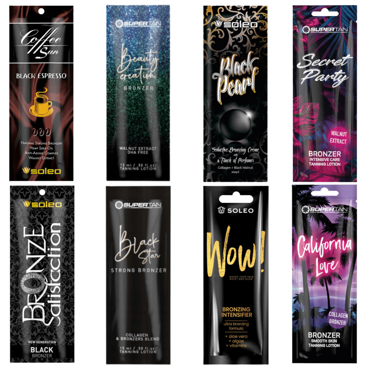 Soleo Coffee Sun Black Espresso Bronzer Set x8. Močan udarec naravnih sestavin. Močna, hranilna nega. Za vse redne solarije, ki obožujejo temno rjave odtenke globoko pražene kave in cenijo tisto, kar prihaja iz narave. Rastlinske sestavine, kot so eritruloza, orehov izvleček in konopljino olje v kombinaciji z DHA, dajejo vaši koži takojšen odtenek čudovito poletnega brona. Supertan Beauty Creation bronzer 15 ml. Očarajte z zapeljivim pogledom in samozavestjo! Bronzer Beauty Creation bo med sončenjem vašo kožo odel v čudovito zlato porjavelost. Naravno sestavljeni bronzerji v kombinaciji z aloe vero zagotavljajo globoko vlaženje in privlačen videz. Ta edinstven izdelek vsebuje samo naravne bronzerje. Soleo Black Pearl ultra močan bronzer 15 ml. Izjemno. Močna. Super učinkovito. Za najzahtevnejše stranke, ki hrepenijo po mega bronastem videzu in popolnoma udobni negi kože. Zapeljuje s svojo strokovnostjo in močjo ter norim, obdajajočim vonjem skrivnostnega jasmina. Vsebuje vse, kar vaša koža potrebuje: bogato mešanico učinkovitih in dokazano bronzirajočih sestavin (DHA, eritruloza, melanin, izvleček oreha), močne antioksidante, kot je vitamin E, učinkovite vlažilne in učvrstitvene spojine (aloja in kolagen), krepilne, hranilne in gladilne sestavine (karitejevo maslo in jojobino olje) ter vitamine B za regeneracijo, pomirjanje in preprečevanje gub (B2, B3, B6). Supertan Secret Party Bronzer 15 ml. Spomnite se vročih večerov na plaži in zabav ob mesečini. Želite plesati vso noč, izgledati in se počutiti lepo. Novi Secret Party bronzer s sladkim vonjem citrusov bo vaši koži dodal sijaj in energijo. Zagotavlja hitro porjavelost, kožo navlaži in jo naredi popolnoma gladko. Kombinacija bronzing sestavin in tirozina zagotavlja dolgotrajno naravno porjavelost. Soleo Black Bronzer Satisfaction za sončenje 15 ml. Ustvarjen za izjemno zadovoljstvo! Hitra, globoka porjavelost. Dolgotrajna porjavelost. Luksuzna, čudovito regeneracijska nega. Popoln za že zagorele in tiste, ki se sončite redno. Moč izdelka je v mešanici 10 sestavin, ki prispevajo k hitremu videzu želene bronaste polti. Vsebuje DHA, visok odmerek eritruloze, beta-karoten, melanin, kano, karamelo in izvleček orehov. Supertan Black Star ekstra močan bronzer 15 ml. Osupnite z močjo Black Star! Ta spektakularni multibronzer bo poskrbel za hitro, zlato-rjavo porjavelost in brezhibno kožo. Aktivne sestavine za nego kože in antioksidanti bodo podaljšali intenzivnost in obstojnost vaše porjavelosti ter vas oslepili! Soleo Vau! Bronzer za ultra porjavitev 15 ml Soleo Vau! Bronzer priporočamo: tistim, ki se redno sončite in ohranjate brezhibno porjavelost. Močan bronzer z vitamini in alojo. Učinkovine: DHA, izvleček oreha, tirozin, aloja, alge, vitamini: b6, b3, b2. Dišava: tropsko sadje. Supertan California Love bronzer s karitejevim maslom 15 ml. Natrpane ulice in zabava v Los Angelesu spodbujajo čute. Z novim bronzerjem California Love se boste počutili kot na sanjskih počitnicah v mestu angelov. Hitri rezultati porjavelosti, popolno navlažena koža in omamen vonj tropskega sadja – to je točno to, kar potrebujete! Ta mešanica močnih bronzerjev in kolagena je inovativna formula, ki kožo navlaži in ji daje naravno, intenzivno porjavelost. Dišava: tropski koktajl.