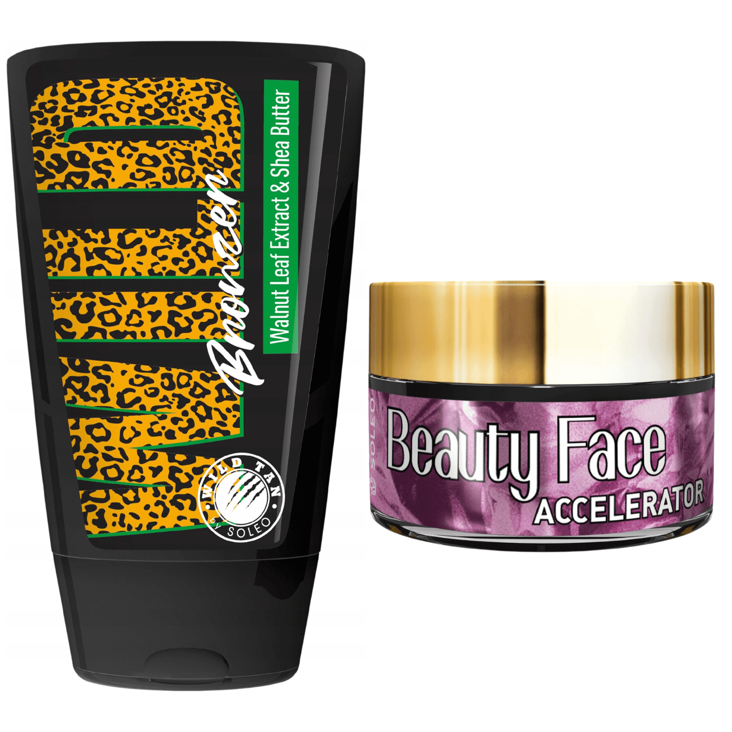 Wild Tan Wild bronzer z orehom + Beauty Face Jar Wild Tan Wild bronzer z orehom 125 ml bronzer z mešanico naravnih bronzerjev. Zagotavlja čudovito dolgotrajno porjavelost. Dišava: havajska roža. Kapaciteta: 125 ml. Ekstrakt orehov. Soleo Beauty Face Accelerator. Intenzivno vlažilni pospeševalnik porjavitve obraza, vratu in dekolteja s kolagenom. Mešanica sestavin proti staranju in pomirjujočih sestavin naredi kožo sijočo in mladostno. Beauty Face spodbuja naravni proces melanogeneze in podaljšuje porjavelost. Hitro se vpije, koža pa ostane prožna, navlažena in lepa. Dišava: rožnati cvetovi. Kapaciteta: 15 ml. Sestavine: Tirozin – pospešuje porjavelost. Izvleček aloje in kamilice – intenzivno vlaži in pomirja. Kolagen regenerira in učvrsti kožo ter zagotavlja učinke proti staranju.