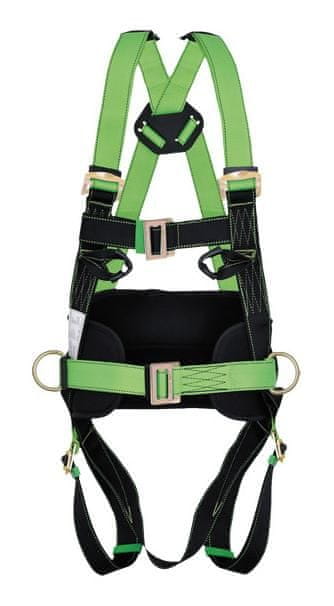 Celoten pas z delovnim pasom za pozicioniranje. En D-obroč zadaj in dve tekstilni zanki spredaj za preprečevanje padcev, dva diagonalna obroča v višini bokov za nastavitev, priložen delovni pas za pozicioniranje, nastavljivi stegenski in prsni trakovi, pas v zgornjem delu stegen, pas širine 44±1 mm iz poliestra, šivalna nit iz visoko natezno odpornega belega poliamida, izpolnjuje zahteve standardov EN361 in EN358.