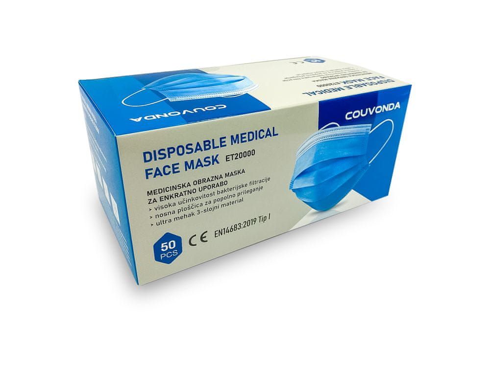 Pakiranje vsebuje 50 kosov zaščitnih mask, ki so namenjene enkratni uporabi.
