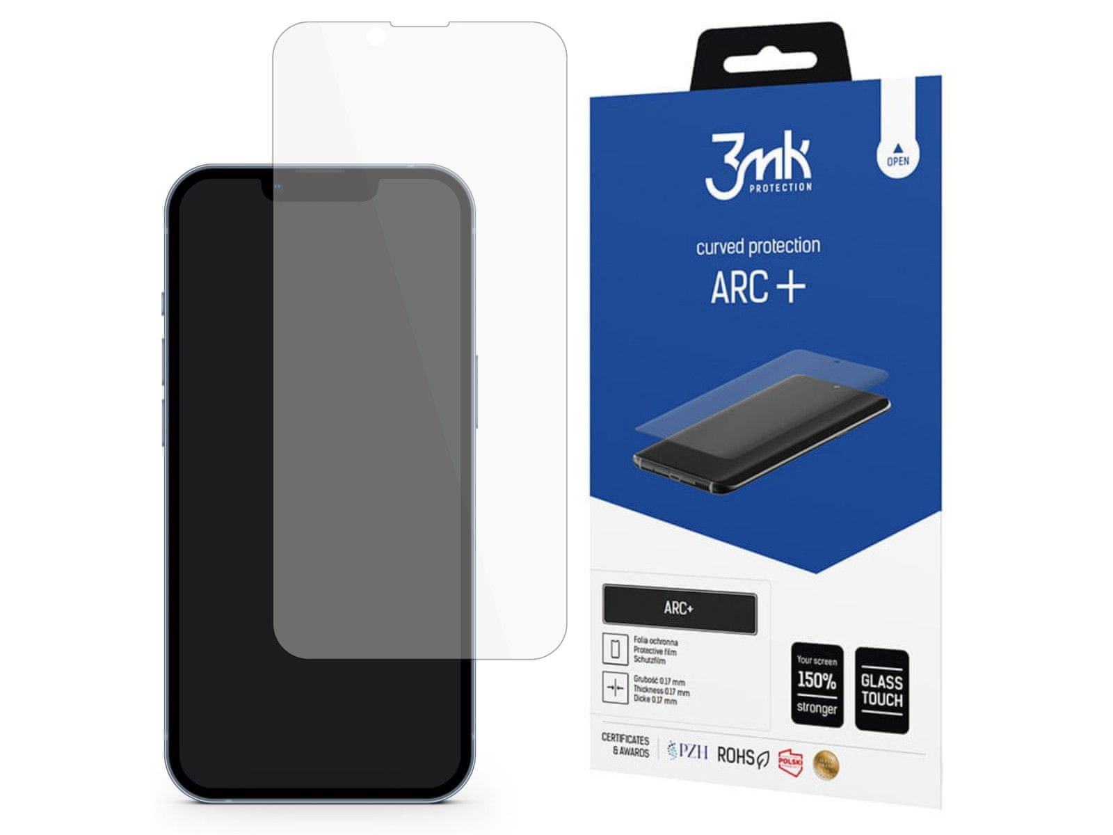 Zaščitna folija 3mk ARC+, namenjena telefonu Apple iPhone 16E, zagotavlja odlično zaščito zaslona in se odlično prilega tudi ukrivljenim zaslonom.