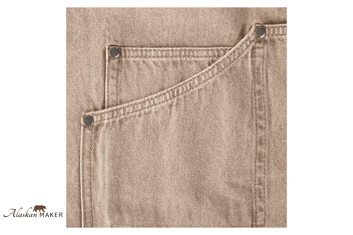 Na voljo imate tri velike žepe. Osrednji velik žep ima za 2/3 uporabnega prostora in dva stranska žepa, ki sta zelo lahko dostopna. Na levi strani je še majhen žepek za svinčnik, da je na dosegu roke. Na desni je še en žep za telefon. Ko je delo opravljeno, ga preprosto obesite z zanko.