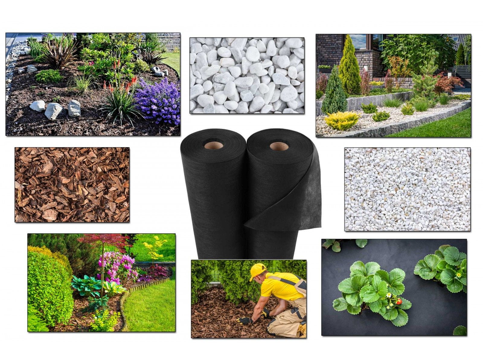 Črna agrotekstilna tkanina za mulčenje, ki se uporablja v vrtnarstvu, kmetijstvu in drevesnicah.