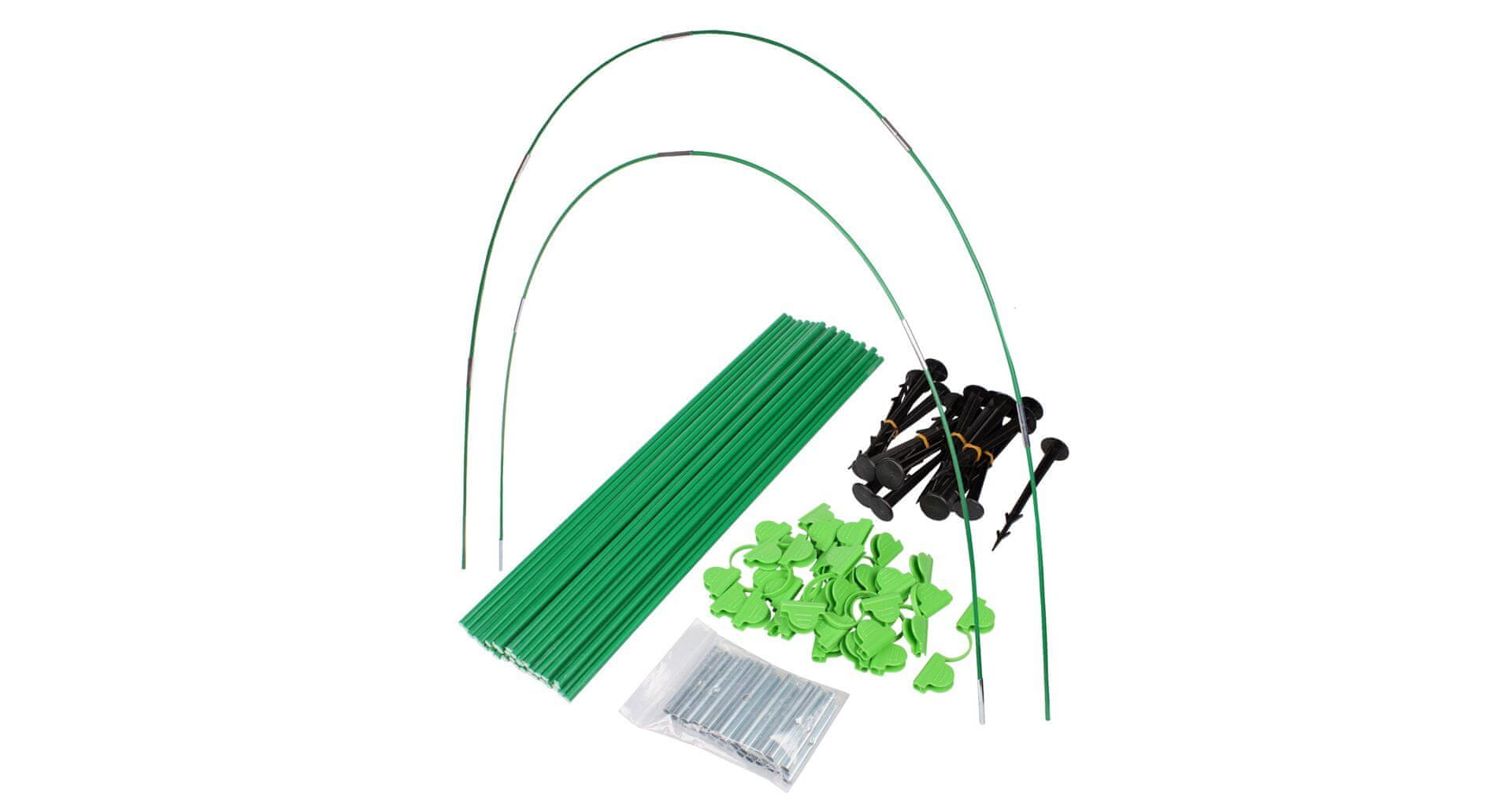 Vsebina paketa: – 36 kosov palic dolžine 43 cm premera 5 mm material: steklena vlakna – 30 kosov jeklenih spojk dolžine 6 cm – 18 plastičnih sponk – 20 plastičnih zatičev – zaščitna mreža ni vključena.