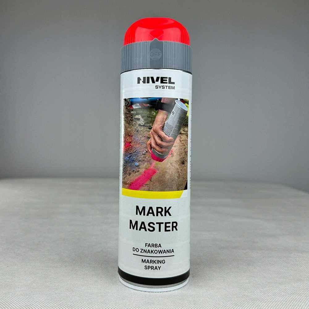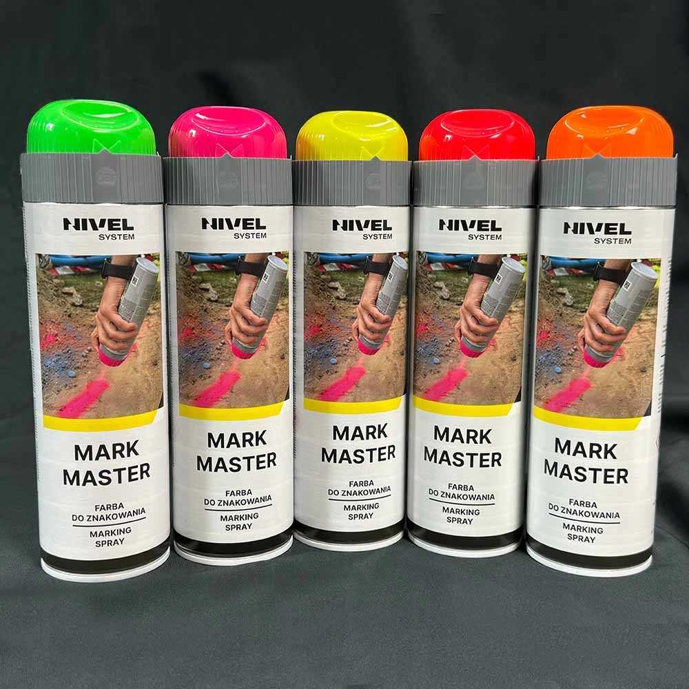 Mark Master Spray podjetja Nivel System je visokokakovostna fluorescentna barva v spreju, idealna za označevanje na gradbiščih ter med geodetskimi in merilnimi deli. Omogoča vam ustvarjanje zelo vidnih, odsevnih oznak, označevanje izkopov na gradbišču ali označevanje opravljenih geodetskih meritev. Uporaba barve Mark Master znatno poenostavi delo, zagotavlja zelo vidne in dolgotrajne merilne oznake, vse z minimalnimi stroški.