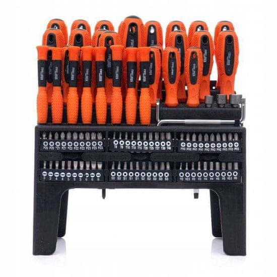 Ta komplet izvijačev in nastavkov Kraft&Dele je odličen dodatek za vsako garažo ali delavnico. Priloženo stojalo omogoča enostavno shranjevanje izvijačev. Uporaba visokokakovostnih materialov v proizvodnem procesu podaljšuje življenjsko dobo izvijačev in nastavkov. Komplet je sestavljen iz 100 kosov.