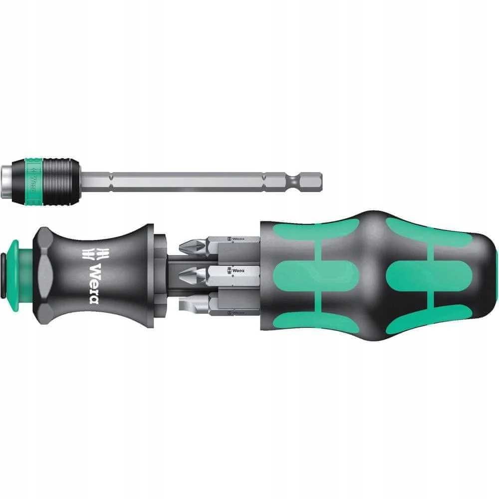 Profesionalni ročaj znamke Wera za 1/4" vijačni nastavki (bit) tip C 6,3 z dolžino 25 – 50 mm. Ročaj z držalom je izvijačno orodje, uporabno za vse vrste industrijskih in delavniških montažnih ter servisnih del. Celota je sestavljena iz ročaja z nastavkom za 6 nastavkov in izvlečnega magnetnega držala za nastavke, ki ga je mogoče nastaviti v 2 položaja. Šesterokotni obroč na ročaju olajša delo in preprečuje kotaljenje z ravnih površin.