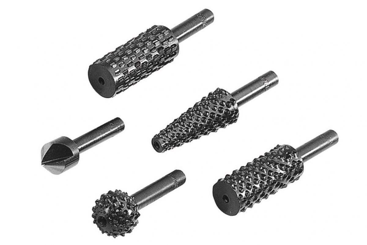 • komplet vsebuje: 1 x profilirana rašpa, ø 12 mm, valjasta, les 1 x profilirana rašpa, ø 5 – 12 mm, stožčasta, les 1 x profilirana rašpa, ø 14 mm, okrogla, les 1 x profilirana rašpa, ø 12 mm, valjasta, kovina 1 x ugrezilo, ø 12 mm, les