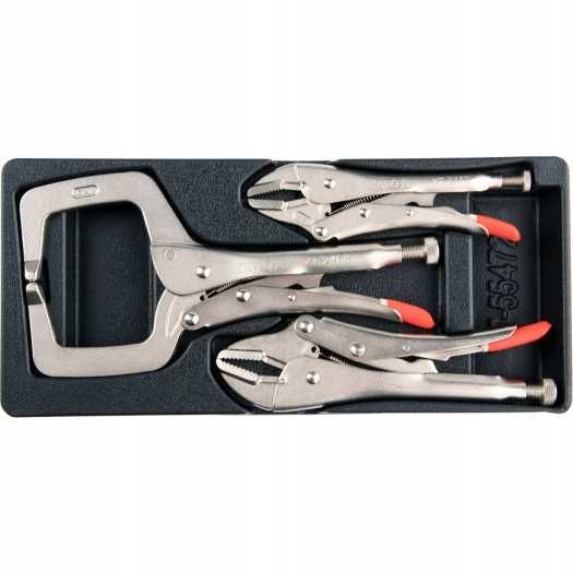 Vložek za predal, ki vsebuje 3 samozaporne klešče. Klešče z zaskočnim sistemom omogočajo hitro vpenjanje čeljusti na material. Izjemno uporabne za varjenje, kovičenje ali vrtanje. Vpenjalo se sprosti s posebno ročico.