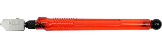 Yato oljni nož za steklo, dolžine 178 mm. Opremljen s premično delovno glavo z rezalnim kolesom iz volframovega karbida YD05 s trdoto HRA 92,5–93. V ročaju je rezervoar za olje za stalno mazanje rezila med rezanjem.