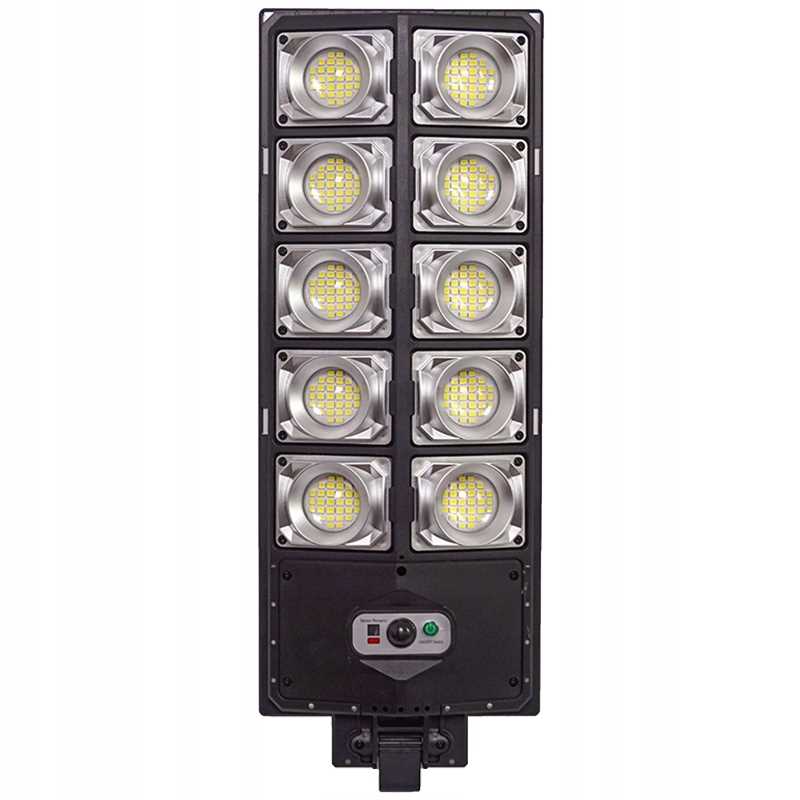 800W zunanja sončna svetilka. Sončna celica na vrhu svetilke čez dan zbira sončno energijo in jo shranjuje v vgrajeni bateriji. Po temi svetilka uporabi predhodno shranjeno energijo za napajanje LED diod in zagotavljanje osvetlitve. Vgrajeni senzorji gibanja in mraka zagotavljajo, da se svetilka vklopi le, ko je to potrebno. Kombinacija senzorjev omogoča, da svetilka deluje le po temi, če je zaznano gibanje. Svetilka je opremljena s tremi načini, ki se razlikujejo po intenzivnosti svetlobe. Za daljinsko upravljanje funkcij svetilke je priložen IR daljinski upravljalnik.
