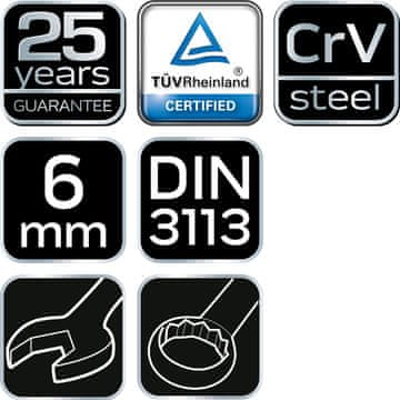 Viličasti ključ NEO (ref. št. 09–706) dimenzij 6 × 100 mm, izdelan v skladu s standardom DIN 3113 Visokokakovostno krom-vanadijevo jeklo zagotavlja dolgotrajno obstojnost ključa. Kakovost orodja potrjena s certifikatom TÜV in 25-letno garancijo proizvajalca. Blagovna znamka NEO izpolnjuje pričakovanja profesionalcev.