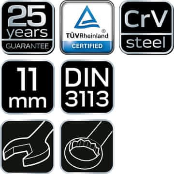 Viličasti ključ NEO (ref. št. 09–711) dimenzij 11 × 150 mm, izdelan v skladu s standardom DIN 3113 Visokokakovostno krom-vanadijevo jeklo zagotavlja dolgotrajno obstojnost ključa. Kakovost orodja potrjena s certifikatom TÜV in 25-letno garancijo proizvajalca. Blagovna znamka NEO izpolnjuje pričakovanja profesionalcev.