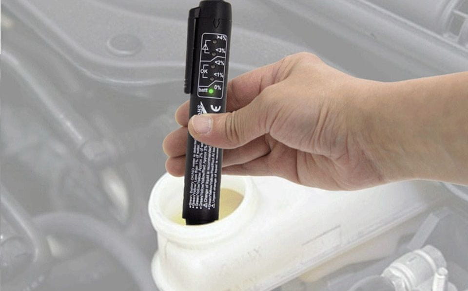 Tester vam omogoča hitro in udobno preverjanje vsebnosti vode v zavorni tekočini . Osnovni parameter, ki določa kakovost zavorne tekočine, je vrelišče, ki je tesno povezano z vsebnostjo vode. Vsebnost vode približno 3,5 % zniža vrelišče tekočine za približno 100 °C. Celoten opis