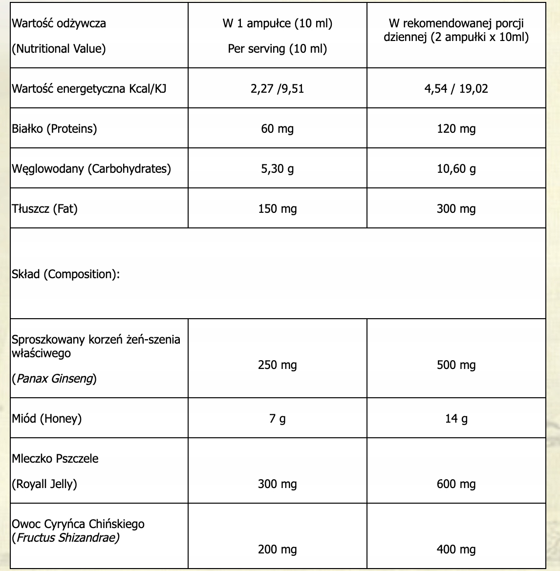 Sestavine: Prašek korenine sibirskega ginsenga 7000 mg (Eleuteroccus senticosus), matični mleček 200 mg (matični mleček), med, destilirana voda.